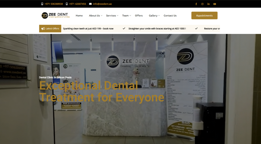 Zee Dent Clinic in Dubai Silicon Oasis is a trusted destination for both dental and dermatology care. With a team of experienced dentists and skilled dermatologists, the clinic offers a wide range of treatments, from general and cosmetic dentistry to advanced skin care procedures. Combining modern technology with a patient-first approach, Zee Dent provides affordable, high-quality services in a welcoming environment. Whether you’re looking to perfect your smile or enhance your skin health, the clinic is committed to delivering exceptional care tailored to your needs.
